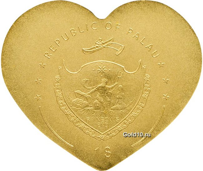 Контур сувенирной монеты выполнен в виде стилизованного сердца. В центре ее аверса отчеканен герб Республики Палау. Над ним полукругом выгравирована надпись – «REPUBLIC OF PALAU». Под ним указан номинал – «1$».